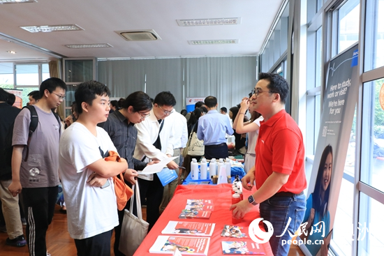 活動現(xiàn)場,航司、銀行、警局、留學服務(wù)機構(gòu)等單位代表為學生提供咨詢服務(wù)(攝影 王泉驕)
