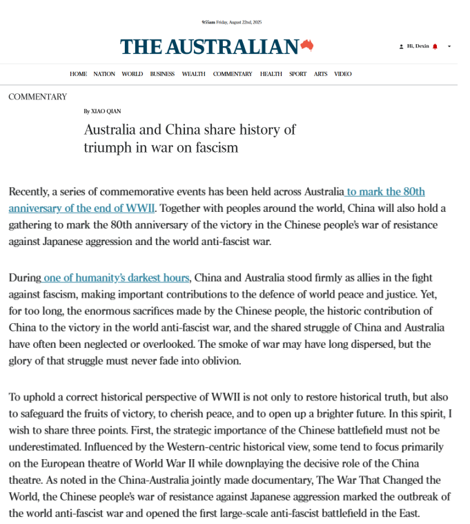 2025年8月22日,駐澳大利亞大使肖千就紀念中國人民抗日戰(zhàn)爭暨世界反法西斯戰(zhàn)爭勝利80周年,在澳第一大報《澳人報》發(fā)表題為《堅持正確史觀捍衛(wèi)國際正義》的署名文章,強調(diào)中國戰(zhàn)場的戰(zhàn)略地位、中澳并肩作戰(zhàn)的歷史記憶、承認臺灣回歸的重要意義不容忽視,堅持正確史觀不僅有助于還原真相,還更有助于我們維護勝利果實、珍惜世界和平、開創(chuàng)美好未來。中澳作為反法西斯的堅定盟友,應(yīng)共同堅守正確史觀,捍衛(wèi)國際正義,為國際社會的持久和平、世界人民的共同福祉和中澳關(guān)系的美好未來攜手努力,共創(chuàng)美好明天。全文如下: